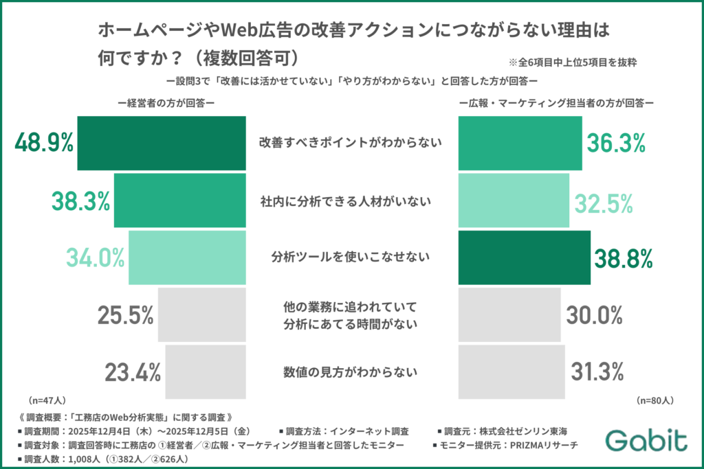 「ホームページやWeb広告の改善アクションにつながらない理由は何ですか?(複数回答可)」と質問したところ、経営者では『改善すべきポイントがわからない(48.9%)』と回答した方が最も多く、『社内に分析できる人材がいない(38.3%)』『分析ツール(Google Analytics 4、Google Search Consoleなど)を使いこなせない(34.0%)』となりました。